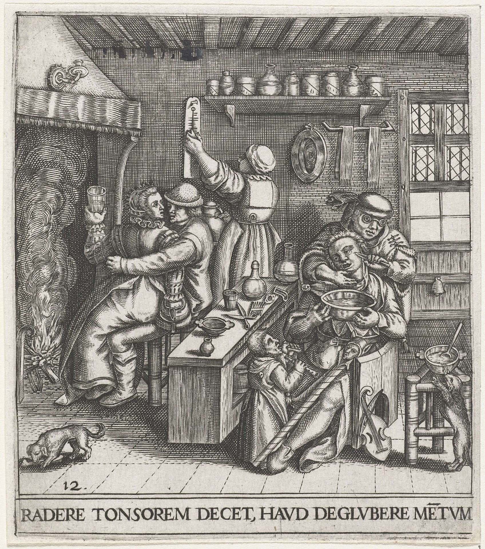 - The Procuress (ca 1620), chiaroscuro woodcut in three blocks (black line and two brown tone) block: 22.10 × 34.2 cm, sheet: 22.3 × 34.4 cm, after a design by Georges Lallemand (French, ca 1575–1636), by Ludolph Büsinck (1590s–1669). Amsterdam, Basel, Berlin, Boston (MFA), Coburg, Dresden, London (BM), Munich, New York (MM), New York (NYPL), Paris (BN), Paris (IN), Philadelphia, Rotterdam, Vienna, Warsaw. Ref. Stechow (1939: No. 24; SC. 96); Archiv Moeck; Exhibition: French Prints from the Age of the Musketeers, Museum of Fine Arts, Boston, Oct. 21, 1998-Jan. 10, 1999; Website: gallica (2012, b&w). A procuress introduces her charge to a client who offers the lass a slender, flared-bell duct flute (probably a recorder), held upside down, and points to the music in his lap. The image of the old woman is believed to be based on a sketch by Jacques Bellange (1575–1616). Georges Lallemand was born in Nancy in the late 1590s and later taught Nicolas Poussin; he died in Paris (ca 1640).