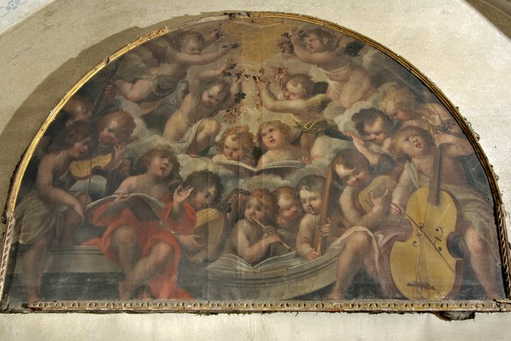 - Musical Angels, ceiling fresco, Antonio Busca (1625–1686). Milan: Sacro Monte di Orta, Ventesima Cappella. The Sacro Monte di Orta consists of 20 chapels with figures in natural terracotta walls and frescoes, the 21st chapel is unfinished. Construction work began in 1591 and continued until the 18th century. In the Ventesima Capella the frescoes are the work of Busca. A host of musical angels sing and play straight trumpets, lute, colascione, syrinx, cello, harp, violin, organ, and two flared-bell pipes. One of the latter appears to be a slender shawm or oboe; the other may be a recorder.
