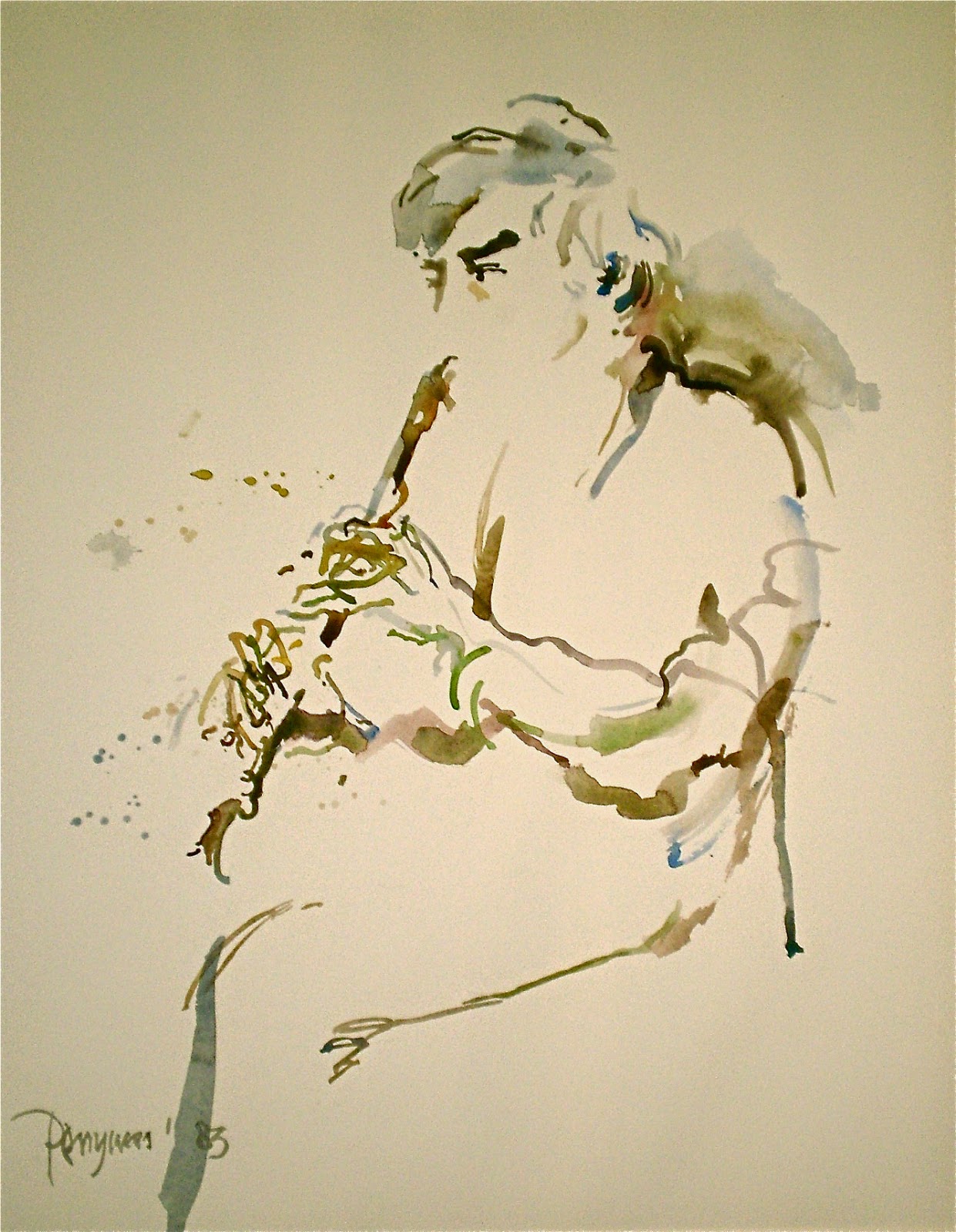 - Naked Boy Playing a Flute, pencil on paper, 59.5 x 33.5 cm, Romano Parmeggiani (1930-2002). Ref. Webiste: artnet (2025). A standing naked youth plays a cylindrical pipe, left hand uppermost. The instrument is probably meant to represent a recorder, given the disposition of his fingers.