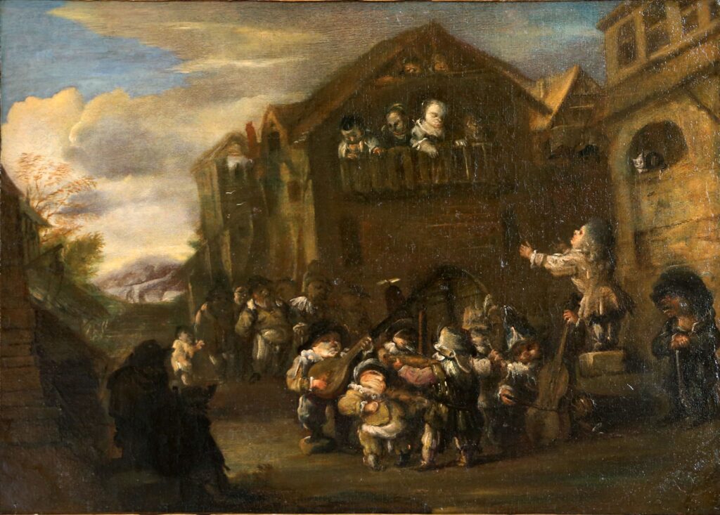 Faustino Bocchi (1659–1742) was an Italian artist active in Brescia who specialized in bizarre genre paintings of dwarfs, specifically bambocciate di nani or arte pigmeo. He appears to have spent almost his entire life in Brescia where he lived as a sybarite. His studio was a sought-after place for cheerful conversationalists, enlivened by the music of the zither of which he was an accomplished player. Bocchi was a pupil of Angelo Everardi (1647–1678), nicknamed il Fiammenghino for his knowledge of Flemish painting. Like his master, Bocchi became a painter of battles and bambocciate, generally seen as humorous or satirical, and often scabrous pieces. Some resemble the decorative conceits of Giuseppe Arcimboldo (1526/7–1593); others suggest the nightmarish world of Hieronymus Bosch (c. 1450–1516). Many of Bocchi’s works in this peculiar idiom depict the battles, cavalry skirmishes, fights, games, dances, feasts, festivals and triumphs of hordes of dwarfs, hunchbacks, midgets, pygmies and animals. Bocchi’s bambocciate predate Jonathan Swift’s Gulliver’s Travels, first published in 1726 by which time the artist was already 67; however, he soon learned about the stories of the Lilliputians, several of which he depicted.