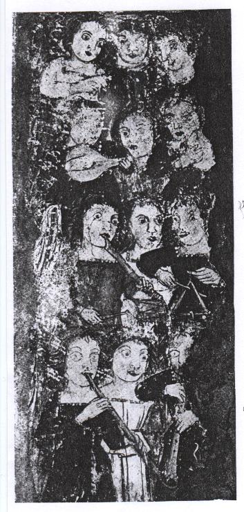 - Panel (1390–1404), wall painting, English. London: Westminster Abbey, Chapter House. Ref. Montagu (1988); Rowland-Jones (1999c: 33; 2006c: 13). This damaged panel shows the lower part of a cylindrical pipe which Jeremy Montagu suggests may be a recorder, despite the bulging cheeks of the player. Kings play psaltery, rebecs, harp, cymbals, organetto, crwth (crowd); angels play lute, nakers, etc.