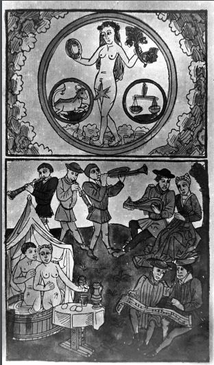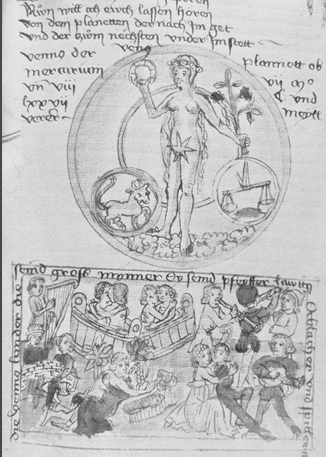 - The Children of Venus (1470–1480), ink drawing, German. Vienna: Osterreichische Nationalbibliothek, Codex Vind. 3085, fo. 24 1°. Ref. Trottein (1993: 157, b&w). In the top panel Venus, naked, holds a circular mirror and a bunch of flowers in the other. In circular insets in each of the lower corners contain a goat (Aires) and a pair of scales (Libra). In a lower panel frizzy-haired musicians sing, play organ, lute, harp, trumpet and a flared-bell pipe (a shawm or possibly a recorder), whilst two couples dance.