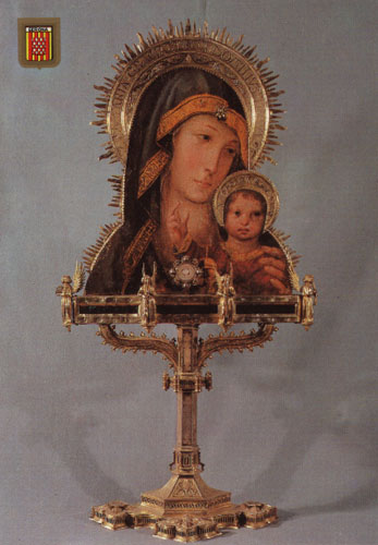 - Veronica Reliquary (1496), Spanish. Girona: Cathedral, Treasury, TCG 72. Ref. Cathedral of Girona: postcard No. 50 (col.); Post (1958, Part 2: 681; Rowland-Jones (1997b, Part 3: 9–10, fig. 14a & b, b&w); Website, flickr: Wilfried Praet’s photostream (2016, col.); Lasocki (2023: 42-3). The reliquary is of gilded silver in the form of a double veronica, the Madonna and Child painted on the obverse and the Salvator Mundi painted on the reverse, both painted in 1520–1525 (i.e. later than the metal-work) by Joan de Borgonya (op. 1503–1525). The base of the reliquary bears the coat of arms belonging to Bishop Berenguer de Pau, who supervised the see of Girona between 1486 and 1506. On the supporting frame, a silver angel plays a basset recorder with a bocal; (predating Virdung’s description of it in 1511); another plays a tenor recorder. Other angels play harp and tambourine, The paintings have also been attributed to the Master of Canapost.