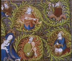 - Jesse Tree (ca 1418), illumination, French (Paris). New York: Morgan Library & Museum, MS M.919 fol. 23r. Jesse, crowned, right hand to face, left hand on left knee, reclines on draped bed, his head on two pillows. Rush mat is on floor. Tree emerging from his lower abdomen, supports Virgin Mary, nimbed and veiled. She stands enclosed in foliate mandorla, holding nude (?) Christ Child, crossed nimbus, right arm extended to her neck. They are flanked by seven kings, crowned, amid foliage, each playing musical instrument, including a cylindrical [duct-flute probably a] recorder, lute, fiddle, harp, gittern, psaltery, and portative organ. Initial L enclosing man wearing turban type of headdress, raising right hand, looking up toward the miniature. Right margin decorated with border of floreate ornament inhabited by a man emerging from foliage, wearing Saracen knotted headdress, indicating with right hand the Jesse Tree, and holding with left hand scroll inscribed LIBER GENERACIONIS (Matthew 1:1); fantastic bird; David, crowned, emerging from flower, playing harp. Lower margin decorated with border of floreate ornament inhabited by: wild man emerging from foliage, raising a pedum [a crosier-shaped staff] with right hand, looking toward elephant carrying on its back, vessel with spout, from which grows flowering plant.
