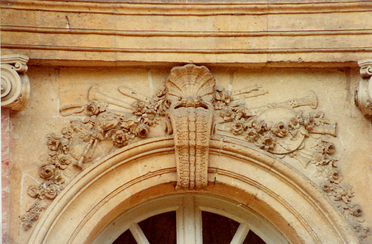 - Swag of Musical Instruments, gilt plaster (Germany, 17th century). Bayreuth: Eremitage/Neues Schloss, Music Room. Ref. Website, flickr: faun070’s photostream (2017). A frame containing a double swag of musical instrument: the upper part comprising a baroque flute and recorder crossed with an open music book, connected by a tassel to a lower part comprising a violin & bow and an oboe crossed with leafy fronds. The recorder is perfectly depicted with details of the beak, window/labium and foot clearly visible. Dating back to the 13th century, the palace was redesigned in the 16th and 17th centuries; after damage suffered in World War II it was rebuilt in the 1950s.