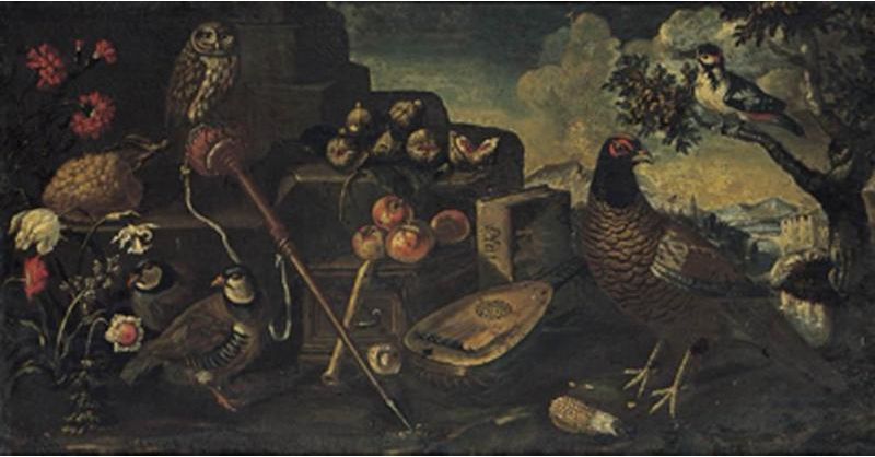 - Still-life with Flowers, Apples, Figs, Fowl and Musical Instruments (17th century), Italian (Lombard). Location unknown: auctioned Sotheby’s (Milan), Sale MI0220, Old Master Paintings, 2 December 2003, Lot 115 (unsold). Ref. Sotheby’s Sale MI0220, Catalogue Old Masters Paintings (2003: Lot 115); Gabrius Databank (2007, col.) On the ground are scattered an elaborate desk with shelves and drawers; two vases of wilting flowers; an owl (on an elaborate perch), a peacock and a guinea-hen; figs and apples; a book; a lute, and an alto-sized renaissance-style recorder with a slightly flared bell. A fourth bird sits in a tree to the right. A town can be seen in the background.