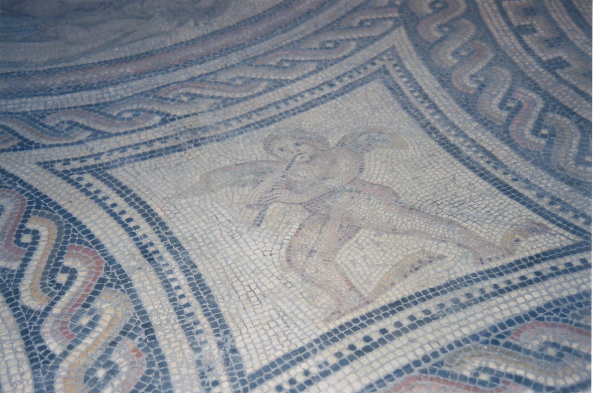 - Winged Amoretto, mosaic, German. Trier: Rheinisches Landesmuseum. Ref. Anthony Rowland-Jones (pers. comm., 2002). “From a mosaic workshop established at Trier (and elsewhere in the Rhine/Moselle region) in mid-1st century AD; about 180 mosaics from the Trier area are extant. In this one a winged amoretto plays an ambiguous single pipe, left-hand lowermost, all fingers down. The instrument is narrow at the lips, of alto/tenor length, slightly outwardly conical throughout, but slender even at the bell (no flare). The mouthpiece touches closed lips at the side of the mouth. The cheeks are not puffed” (Rowland-Jones, loc. cit.)
