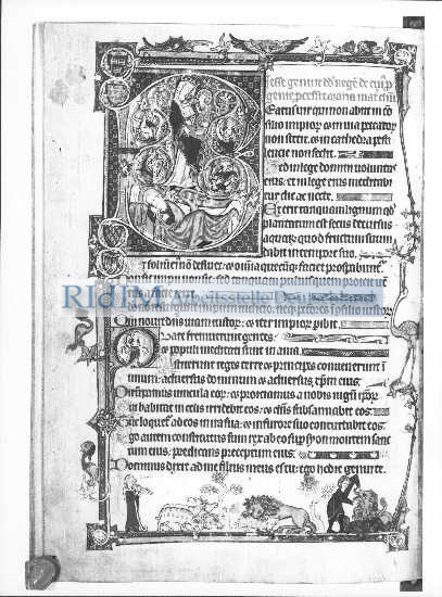 - Psalm 112: B[eatus vir qui timet Dominum] [Blessed is he that feareth the Lord] (13th century), decorated initial, gouache & gold on parchment, German. Munich: Bayerische Staatsbibliothek, Cod. gall. 16, Fol. 7 v. Ref. Munich RIdIM (2009, Mbs – H 509). Above is a decorated initial ‘B’ with a Jesse Tree and King David playing his harp. At the bottom of the page, a shepherd plays a pipe (probably a double pipe, but possibly a recorder) to his sheep. One of the less fearful sheep is being eaten by a lion!