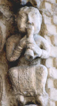 - Man Playing a Pipe (12th century), stone-carving, Spanish. Sangüesa (Navarre): Santa Maria la Real. Ref. Christian Brassy (2002, col.) ? Location. A squatting man plays a flared-bell pipe. A trace of a possible window/labium can be seen, the thumb of the player’s uppermost (right) hand and the little finger of his lowermost hand seems to be covering their holes, so this may represent a recorder.