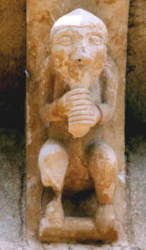 - Grotesque Playing a Pipe (12th century), stone-carved capital, French. Avy sur Pons (near Saintes, Western France): Church. Ref. Christian Brassy (pers. comm., 2000) A grotesque plays a pipe with a wide beak. It could represent a primitive shawm (pibcorn), but a slit-like opening on the front of the beak may represent the window/labium of a duct flute.