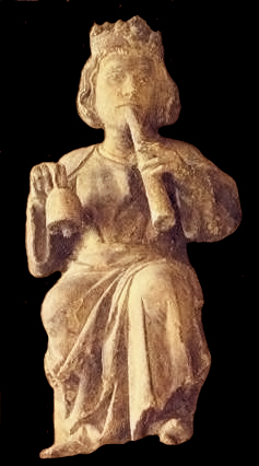 - King with a Pipe and a Bell (13th century), stone carving, Spanish. León: Catedral de Santa María, west facade. A king, seated, plays a conical pipe (probably a duct flute) in one hand and a bell in the other, underarm.