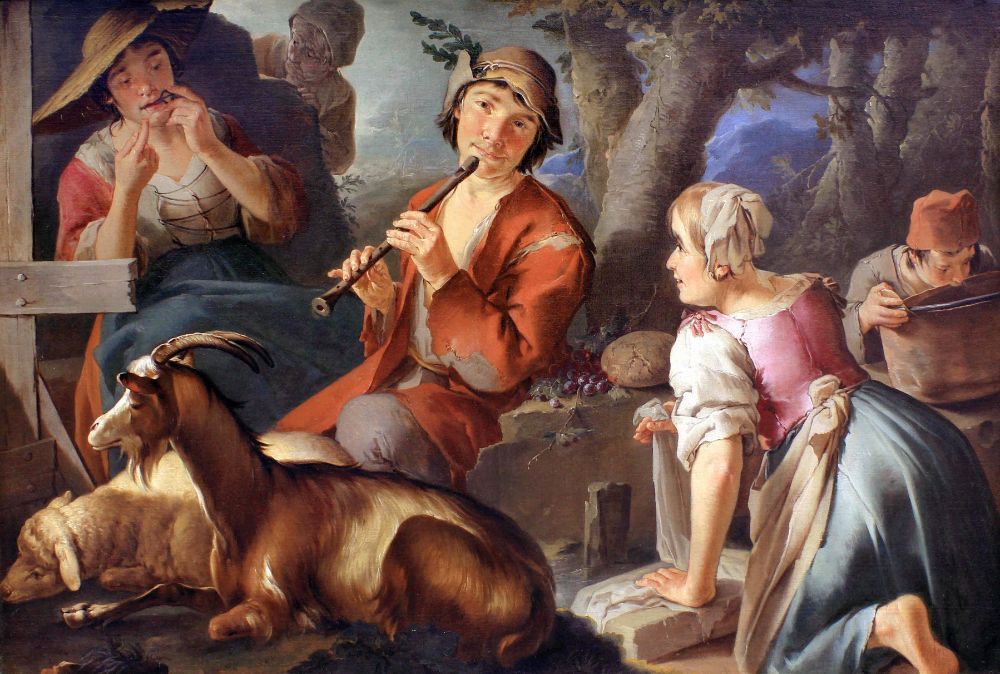 - Shepherd with Nymphs, Amoretti and Goats in a Landscape, oil on canvas, 109 × 135 cm, circle of Andrea Camassei (1602–1649). Knightsbridge: Bonhams, Sale 16860, Old Master Paintings, 28 October 2009, Lot 50. Watched by two admiring nymphs, two tumbling amoretti and a goat, a shepherd sits on a rock playing a flared-bell pipe. Although there is no sign of a beak or window/labium there is no reed, either, and the cross-fingering and bent thumb are very suggestive of recorder playing.