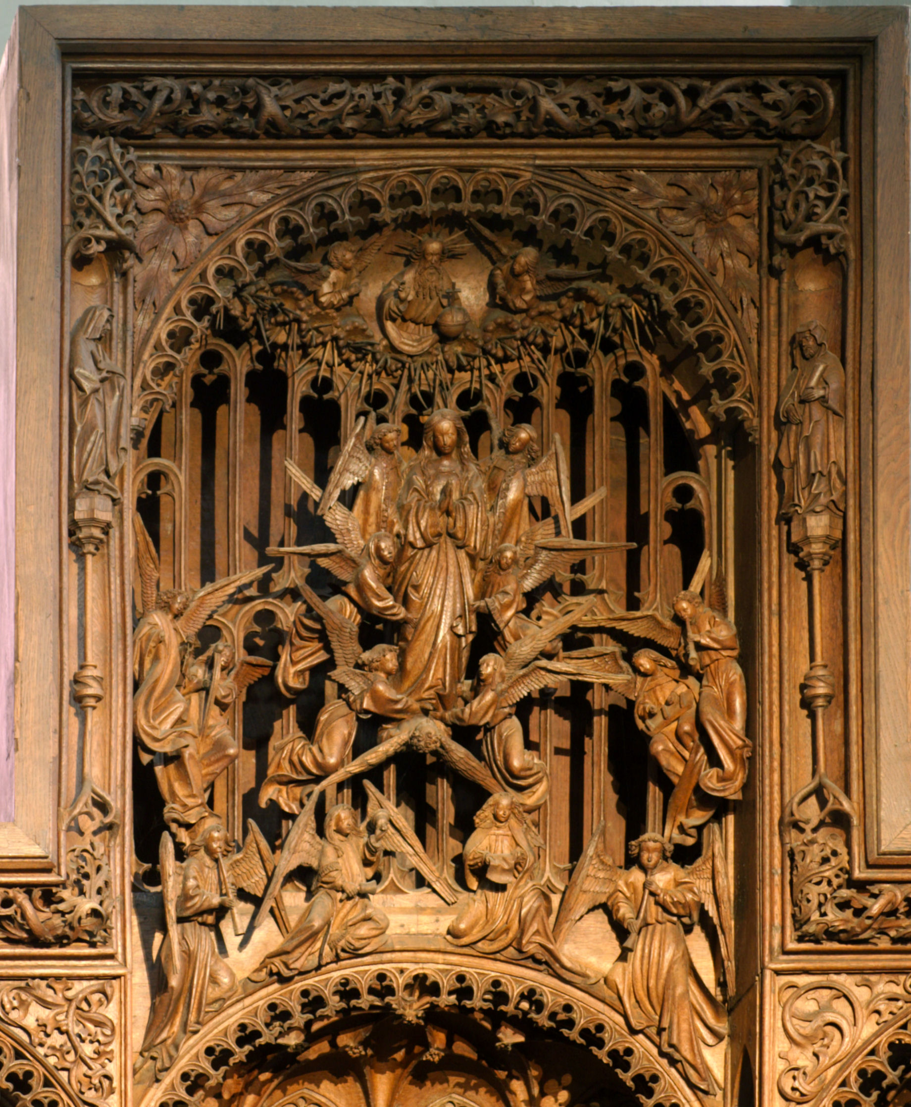 - Marienaltar, centre panel: Assumption of Mary with Angelic Concert (1506–1508), carved wood, Ludwig von Jupan (op. 1486–- m.1538). Kalkar: Nicolaikirche, Marienaltar. Ref. Website: Anges Musiciens (2010, col.) Mary is borne upwards by angels. Beside her, angels play triangle, harp, psaltery, and a conical pipe with a hint of a window/labium, possibly a recorder. Beneath, angels sing and play shawms, hand bells, and a cornetto.
