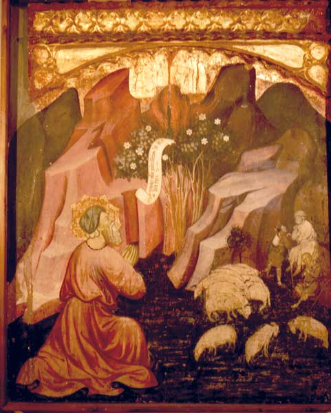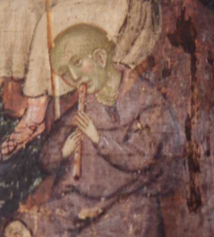 • Guimerà Altarpiece, (ca 1402-1412), tempera on panel, 520 x 730 cm: Moses on Mount Sinai, Ramón de Mur (op. 1412-1435). Vic: Museu Diocesà. Detail. Ref. Wikimedia Commons (2012, col.) Rowland-Jones (1997b: 15, fig. 13, b&w, detail). One of 24 surviving panels from the enormous altar-piece from the church of Guimerà Catalonia Moses prays at the vision of three shepherds watching over their sheep; one shepherd plays a cylindrical duct flute (recorder or flageolet). There is a modern reproduction of this in the church of Guimerà Catalonia.