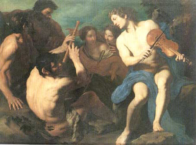 - The Musical Duel of Apollo and Marsyas (1631/1932), oil on canvas, 154 × 198 cm, Pietro Giovanni Novelli (1603-1647). Caen: Musée des Tapisseries, Inv. 10. Ref. Website: Joconde; Darmstädter & Brown (2006: 29, pl. 2 – col.); Ausoni (2009: 75-col.); Website: gallica (2012-b&w) Inspired by a depiction of the same subject by van Dyck. Painted for a Jesuit monastery, because of its religious symbolism. Apollo, seated on a rock or stump plays a violin. Marsyas, seated rather clumsily on the ground below, holds away from his mouth, a tenor/alto size recorder in an almost vertical position. His fingers are slightly drawn back from the uplifted instrument, not quite covering all the holes (left hand lower). In this position the windway can be seen – and it is curved, with the block very slightly obtruding. It is also surprisingly long – the window/labium is very clearly shown in this rather low position. Other than those covered by the outstretched fingers, one upper and three lower finger holes are visible, in line, plus an offset finger hole for the right-hand little finger (presumably blocked), and possibly just visible, the edge of its corresponding pair. The recorder is cylindrical nearly up to the bell end where there is some flare with two incised decorative rings. Notes by Anthony Rowland-Jones (pers. comm., 2000).