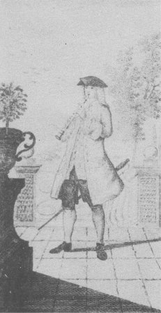 - Quatrième Chambre des Appartements Royaux: La danse: Le Duc de Chartres dans le menuet avec Mademoiselle (1696), engraving, Antoine Trouvain (1656-1708). Ref. Benoit (1971: pl. v, fig. 6 – detail); Anthony Rowland-Jones (pers. comm., 2007); Website: Wikimedia Commons (2010). One of a series of illustrations of activities at court. The two dancers are watched by five seated and two standing royals. On the left are the Duc de Bourgogne (future Dauphin of France); Liselotte, Madame, Duchesse de Orléans; Françoise Marie de Bourbon, Duchess of Chartres (future Duchess of Orléans); Louise Bénédicte, Duchess of Maine (daughter in law of Louis XIV); the Duc de Chartres; Marie Thérèse, Princess of Conti (sister of the Duchess of Maine). On the right are Élisabeth Charlotte, Mademoiselle de Chartres (future Duchess of Lorraine) daughter of Madame; Philippe, Duke of Chartres (future Duke of Orléans and Regent of France) son of Madame. The Duc de Chartres succeeded to the Orléans title in 1701, and he married in 1692. The dancers are accompanied by musicians playing from a gallery behind the audience: two recorder players, one string bass, and two violinists. The recorders, both altos, are slender at the top (where their window/labium can just be made out), and they become very slightly outwardly conical with no bulges with some decorative turnery at the foot which is not flared. This shows that the royal musicians still had old-style recorders, and that the take-up of the new-style instruments was rather slow. One recorder is played left-hand lowermost, the other right-hand lowermost.