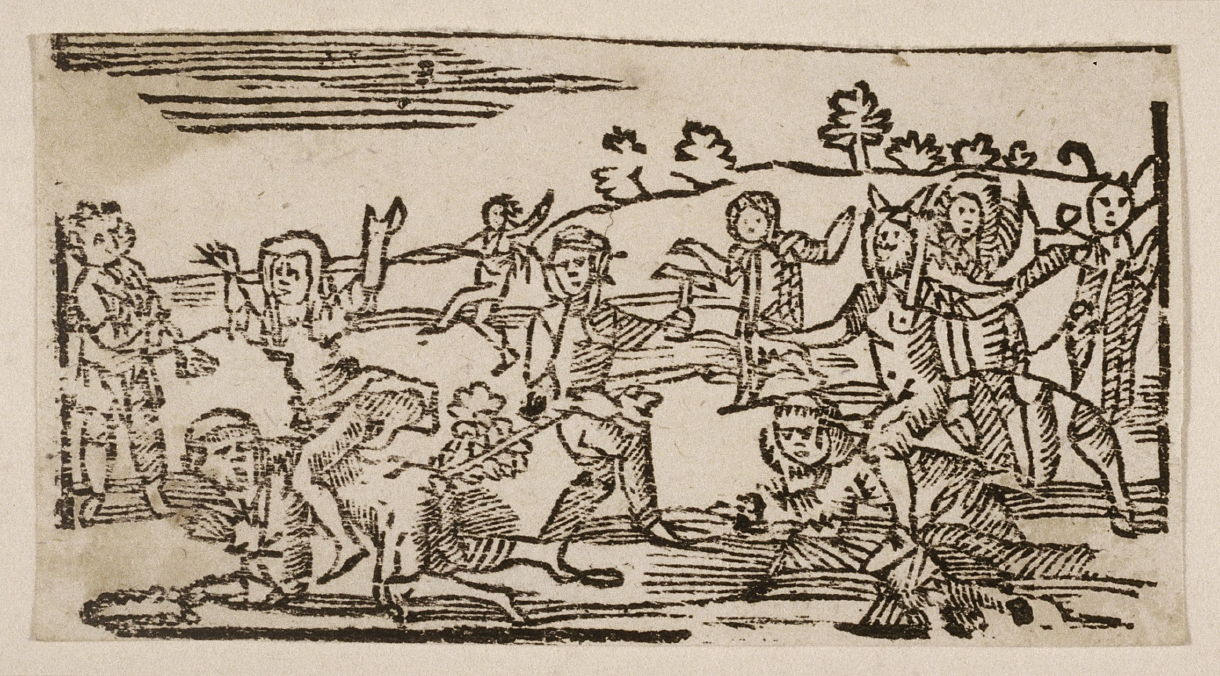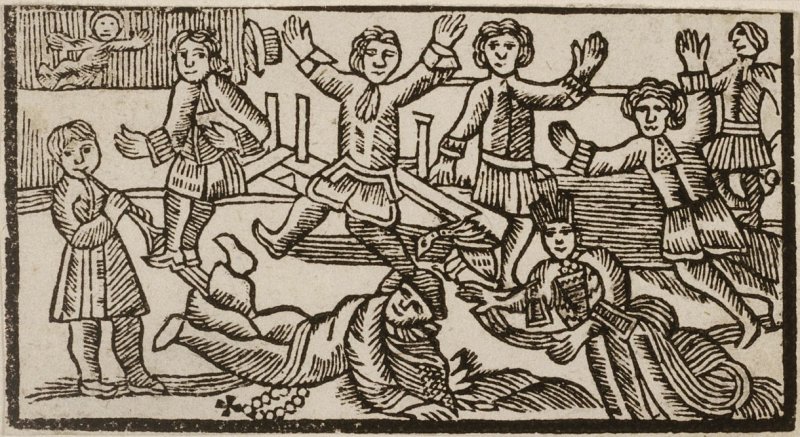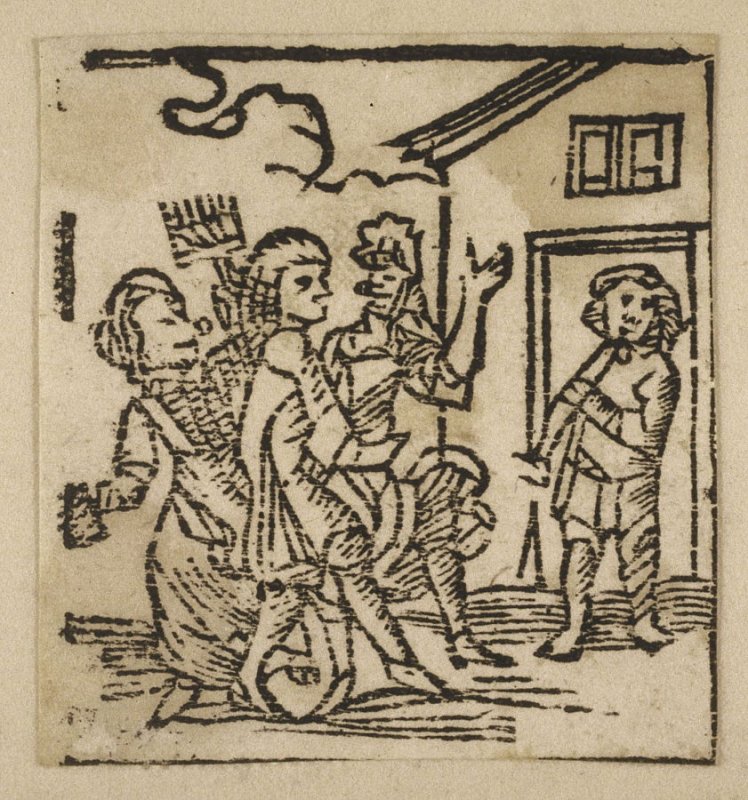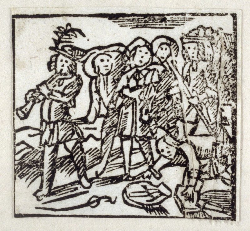 - [Dancers] ? woodcut, ? date, ? artist and/or provenance. San Francisco: Achenbach Foundation for Graphic Arts, 1963.30.21484. Indoors, five men dance in a circle; a priest and a finely dressed woman have fallen to the floor. Music is provided by a standing musician playing a flared-bell pipe (shawm or duct flute, possibly a recorder).