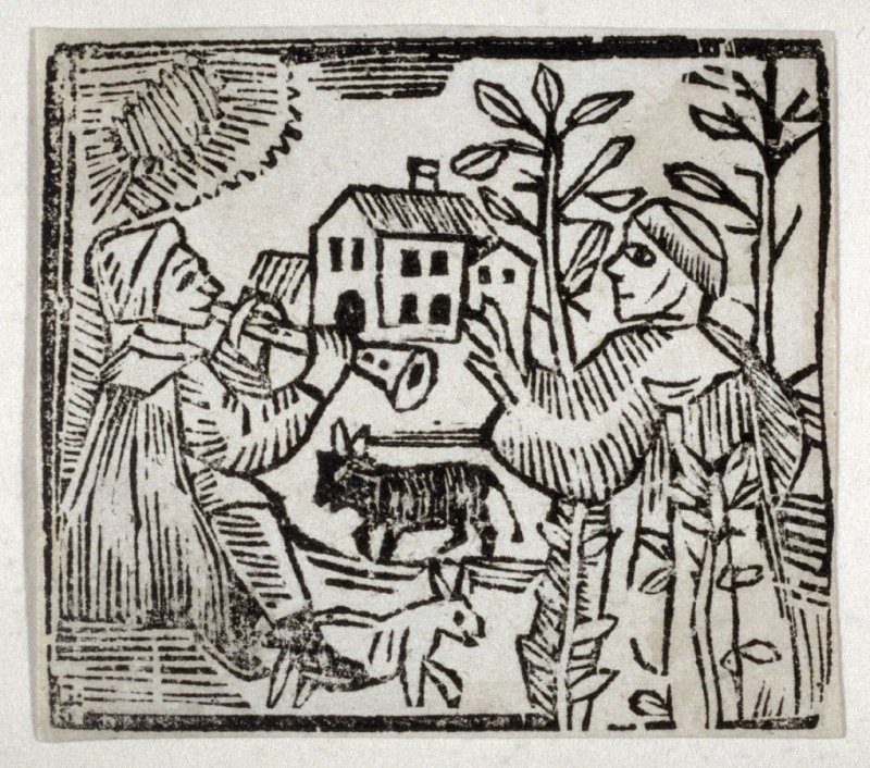 - Rural Scene, ? woodcut, ? date, ? artist and/or provenance. San Francisco: Achenbach Foundation for Graphic Arts, 1963.30.21506. In front of a farmhouse with cattle and corn growing, a monk listens to a man in a cape playing a pipe with a flared bell (shawm or duct flute), possibly a recorder. Several finger holes are visible under the player’s uppermost (left) hand, and two beneath the right hand; the wall of the bell is shown as being very thick, and thus rather more like a recorder than a shawm.