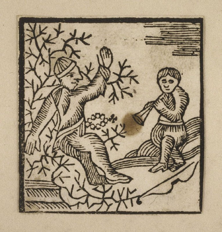 - Trapped Hunter, ? woodcut, ? date, ? artist and/or provenance. San Francisco: Achenbach Foundation for Graphic Arts, 1963.30.21496. A hunter caught in a bramble bush greets a lad walking by who plays a broadly flared pipe (shawm or duct flute, possibly a recorder). The hunter’s bow lies in front of him, on the ground.