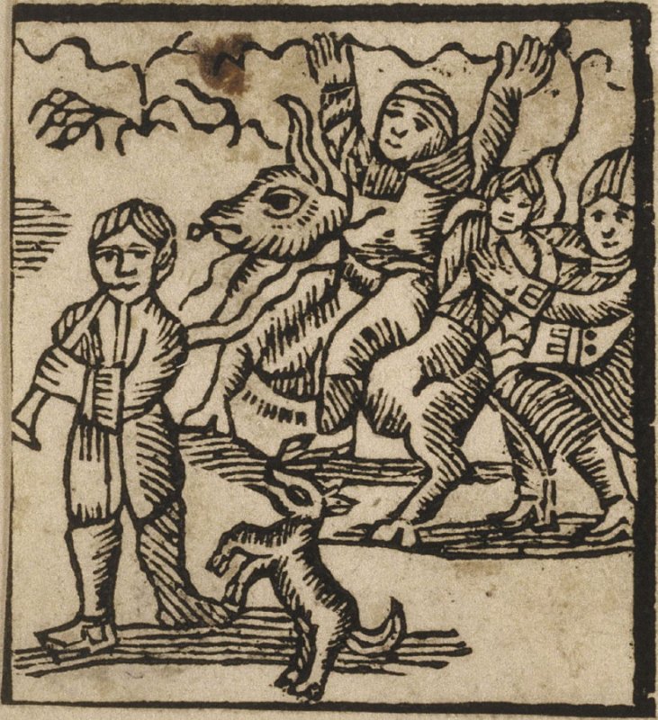 - The Dancing Dog ? woodcut, ? date, ? artist and/or provenance. San Francisco: Achenbach Foundation for Graphic Arts, 1963.30.21451. In the background, a man rides astride a donkey, his arms in the air, and a child is held up to watch. In the foreground a dog dances on its hind legs to music provided by a man playing a pipe with a flared bell (shawm or duct flute, possibly a recorder).