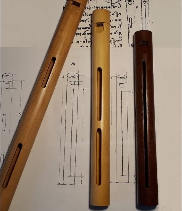Unfortunately, the text does not include data on the dimensions of the flutes or clear clues to their intended use. In experiments carried out in 2019 by Italian recorder maker Giacomo Andreola it was found that flute b (with two slits) can work if it is a little longer than flute a, because its two grooves are shorter but, in that case, they cannot be closed with one hand and in da Vinci’s drawing you can see that it has a length equal to flute a (with a single slit). This raises the question of whether da Vinci was able to build and operate his flutes and observe the functional effects described in the text. In the case of flute a, the groove must be less than the length of the player’s extended index finger; in flute b each of the two grooves must be equal to or shorter than the width of four fingers together. In Giacomo’s experimental reconstructions flute b was found to be the most effective and efficient, with each slot 5.5 cm long.